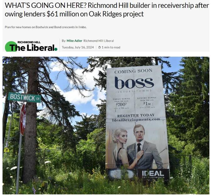 Experts point out that even if another developer buys the project, there's no guarantee that it will be completed, and sometimes ownership can change hands multiple times, so that the supply of much-needed housing can be delayed for years. One example is the 72-townhome project in the Oak Ridges neighborhood of Richmond Hill.In 2022, King Development purchased parcels 8, 10, 12, 14, 16, and 18 in Bostwick Cres and 2, 6, and 8 in Bond Cres from Ideal (BC) Developments but It was later discovered that the builder was not licensed to build or sell new homes in Ontario. The project was already delayed when King took over because Ideal (BC) Developments was not authorized to build. Shortly thereafter, King went into receivership in June owing $22.5 million to its largest creditor. The properties remain uncompleted, four years after the original buyer purchased the site.